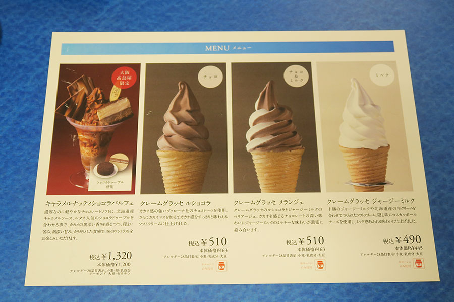 濃厚なチョコソフトにケーキを添えた贅沢パフェ「キャラメルナッティショコラパルフェ」(1食・1320円/各日50食限り/大阪高島屋限定)は、香ばしいアーモンドとほろ苦いキャラメルソースがマッチ。そのほか、ミルクやチョコフレーバーのシンプルなソフトクリーム(490円〜)もスタンバイ。