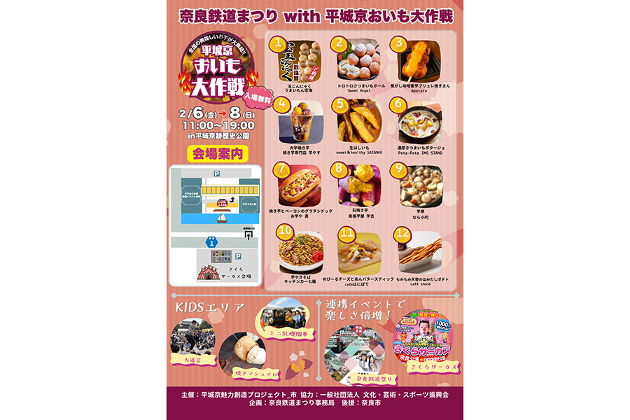 芋グルメが集結するイベント『奈良鉄道まつり with 平城京おいも大作戦』が、2月6日から3日間、奈良「平城京跡歴史公園」(奈良市二条大路南)にて開催される。