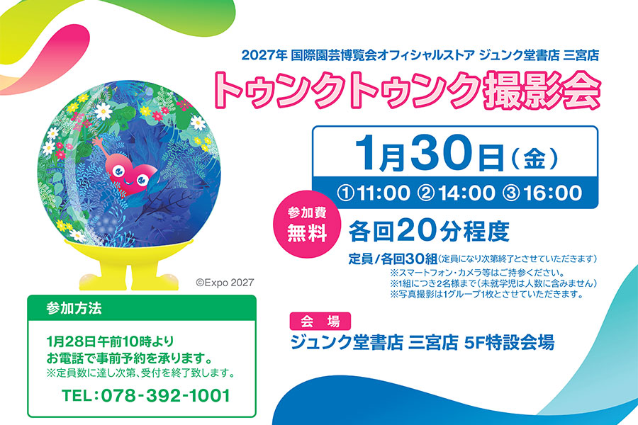 2027年に横浜で開催される「2027年国際園芸博覧会(GREEN×EXPO 2027)」の魅力を発信する新たな拠点として、関西エリア初となる常設店舗「EXPO 2027 オフィシャルストア ジュンク堂書店 三宮店」が1月30日にオープン。公式マスコットキャラクター「トゥンクトゥンク」のグッズなどが販売される。