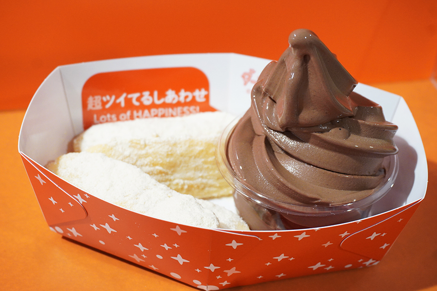なかでも注目は、揚げたてのハッピーターンにパウダー約3倍かけ、チョコソフトにディップしながら楽しむ「超ハッピーターン パウダーマニア チョコソフトクリーム」(648円)。あまじょっぱいハッピーターンに、ビターな味わいのチョコソフトが意外とマッチした大人の味わいに仕上がっている。