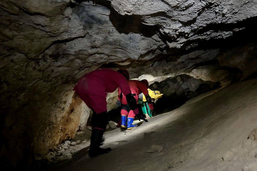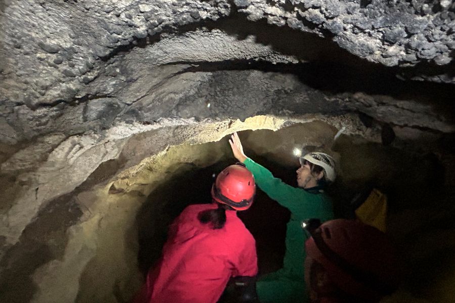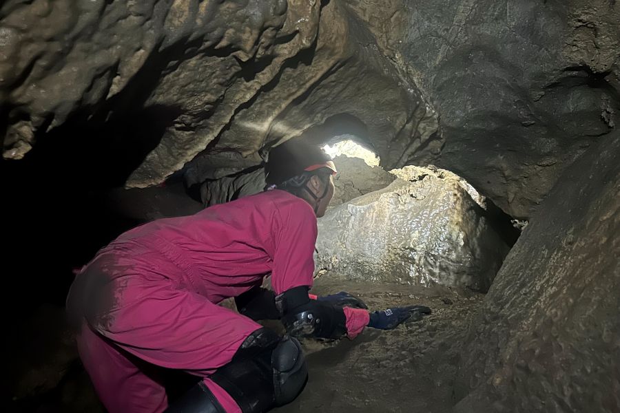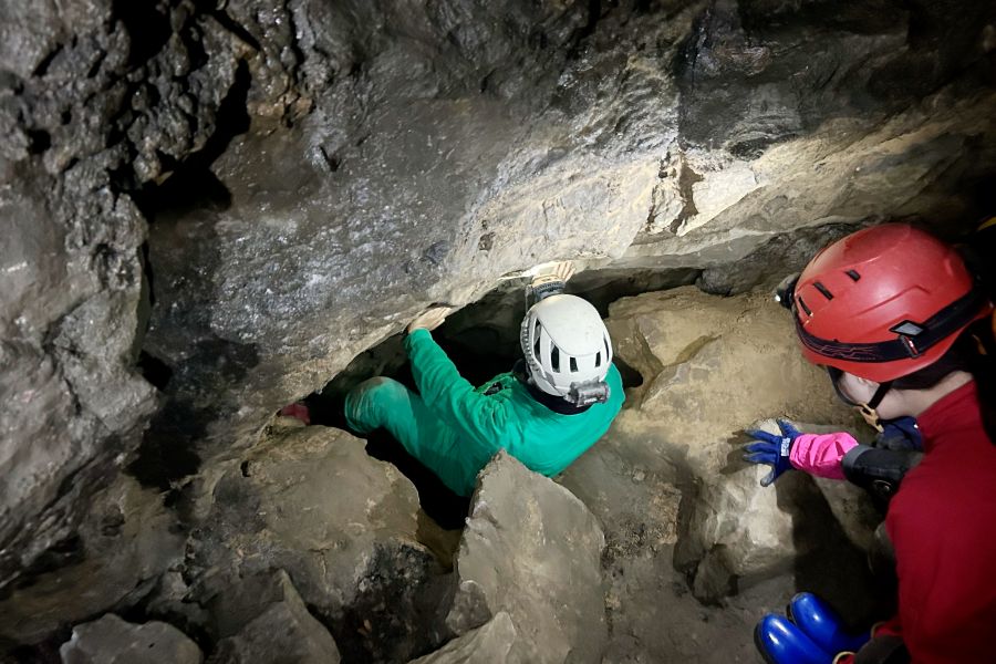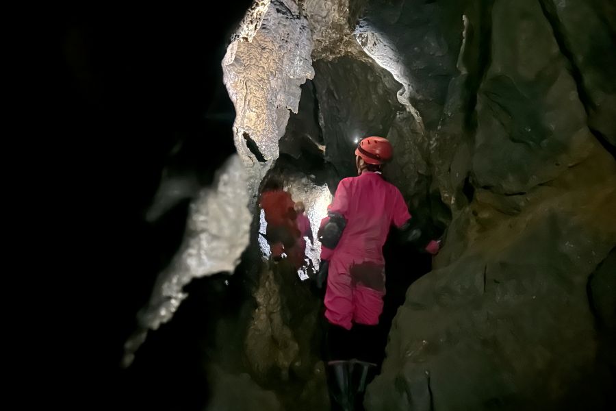 いよいよヘッドライトを点灯させて、真っ暗な洞窟内に潜入。不思議な洞窟の内部はどんなところなのか…。日本ケイビング連盟認定ガイドの解説を聞きながら、奥へ進んでいく。ゴツゴツした岩肌や、雨水が伝ってきた跡など、不思議な光景にドキドキしながら、とにかく前進あるのみ。