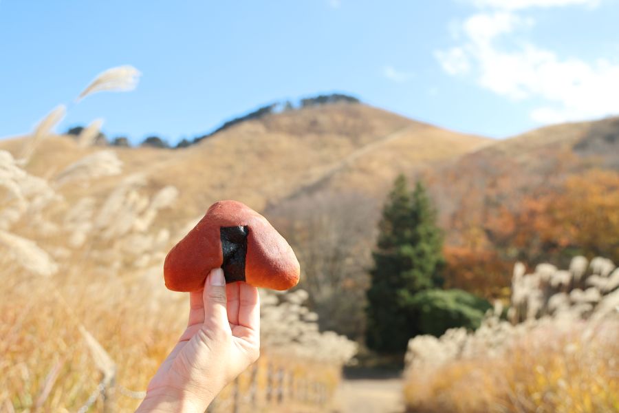 サイクリングの合間のおやつは、「曽爾高原 お米の館」の「おにぎりパン」と「くりパン」。「おにぎりパン」は、曽爾村で収穫したお米でつくったパンの中に、なんと柴漬けがイン。もちもち食感の米粉パンの甘味と、柴漬けの塩味が意外にも相性抜群で癖になりそう…。