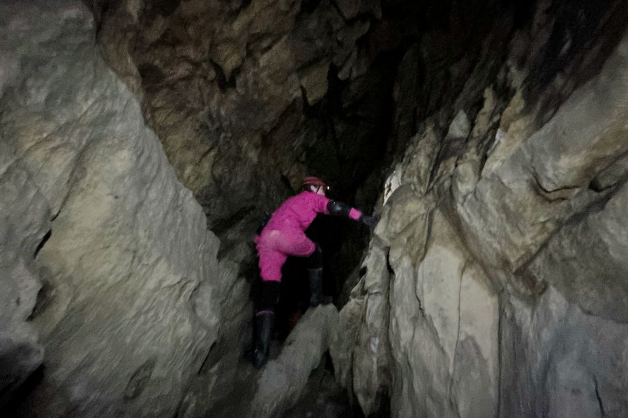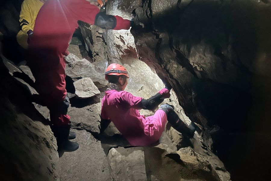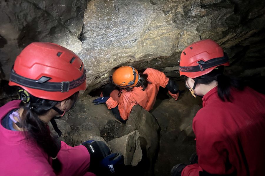 高低差のある場所も細すぎる道もずんずん進む。そのために教えてもらった技術が「チムニー」という手法。縦に長い穴の中を、手足で体を押し付けつつ、壁を蹴りながら移動。はじめての経験に、完全にへっぴり腰で挑んだが、やれば何とか乗り越えられた。