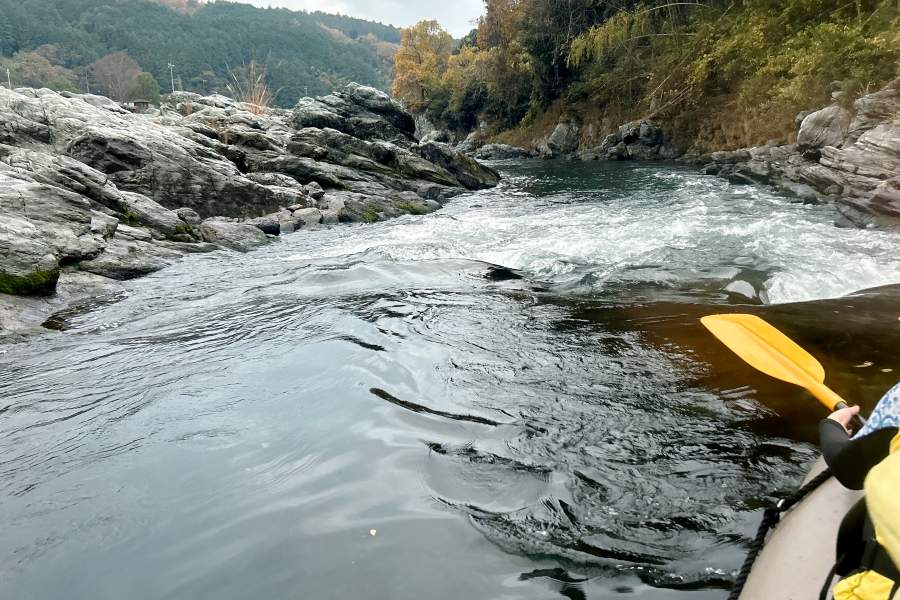 少し慣れてくるころには、川の流れの早い場所や、蛇行する急カーブも登場して、ちょっとしたスリルも味わえる。体験した日は、水量が比較的少ない穏やかな吉野川だったが、それでも「ザバーン」と頭から水しぶきをかぶるようなシーンも。水量の多い日には、より迫力ある川の流れが楽しめ、水しぶきも凄いんだとか。