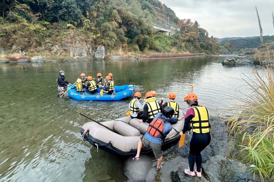 さまざまな水辺のアクティビティが楽しめる吉野川で、今回トライしたのは、ゴムボートに乗って急流を下る「ラフティング」。チームで息をあわせてパドルを漕ぐので、体力に自信がないアウトドア初心者やキッズにもおすすめの人気アクティビティだ。今回参加したさまざまな川遊びを企画する「Sha La Rafting(シャララフティング)」のツアーでは、4歳から80歳までを受け入れている。