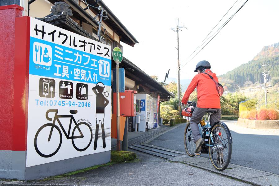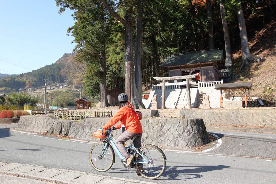 まず体験したのは、曽爾高原のサイクリング。はじめに「須佐之男神社」の前にある「新宅分店サイクルステーション」で、電動アシスト自転車とヘルメットをレンタル。地図を手に、お店の方にこの時期の周辺の見どころを聞き込み。「高原では素敵なススキの景色が楽しめるよ、そこまでがんばってね」と送り出された。