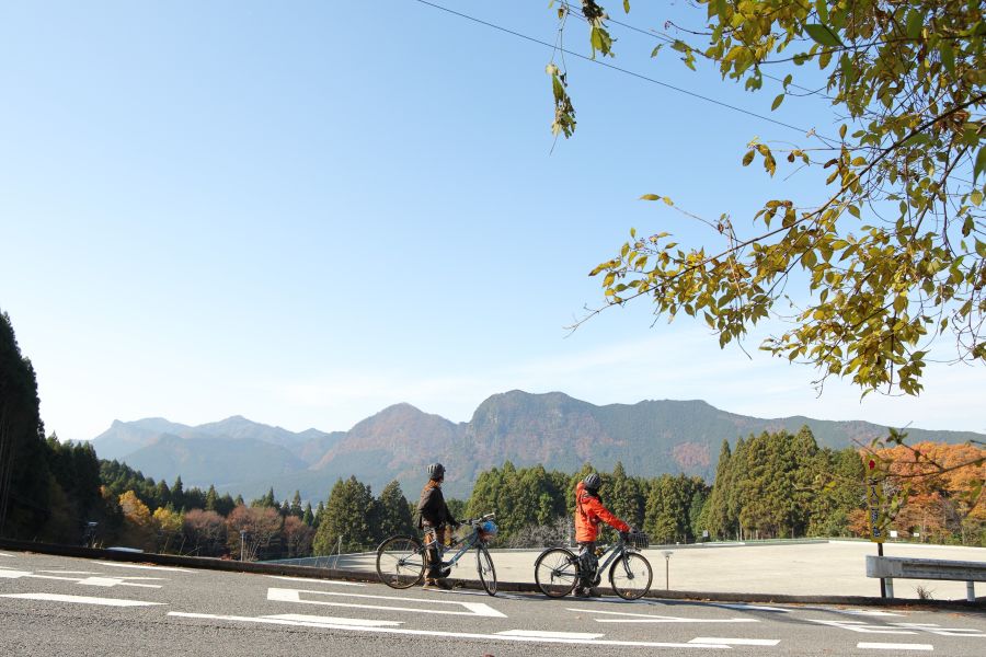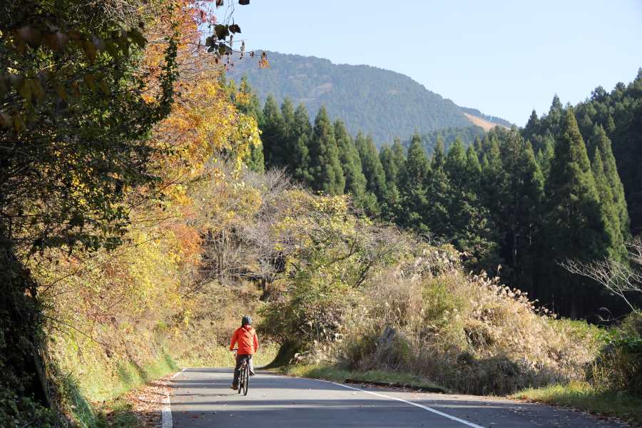 伊賀見集落の橋を渡ると、曽爾高原までは勾配のきつい坂道が続く。今回は、変速が付いているタイプの電動自転車なので、坂道ではギアを切り替えて調整しながら進んでいく。神秘的な杉林、紅葉する木々、国の天然記念物でもある、兜岳や鎧岳を望む見晴らしの良いスポット…この土地ならではの景色の中、風をきって進むのが爽快だ。