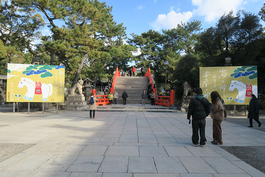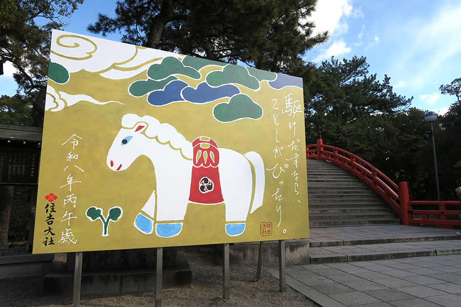 そんな変化し続ける境内で、2月3日までしか見ることができない看板にも注目だ。住吉大社のシンボル的存在・反橋の前に設置された大きな看板には、2026年の干支・午(うま)のイラストと「駆けだすなら、ことしがぴったり。」というメッセージ。神社の空気に馴染みながらも新しさがあり、世代を問わず親しみやすく、そっと背中を押してくれるような存在感のあるデザインが心に残った。