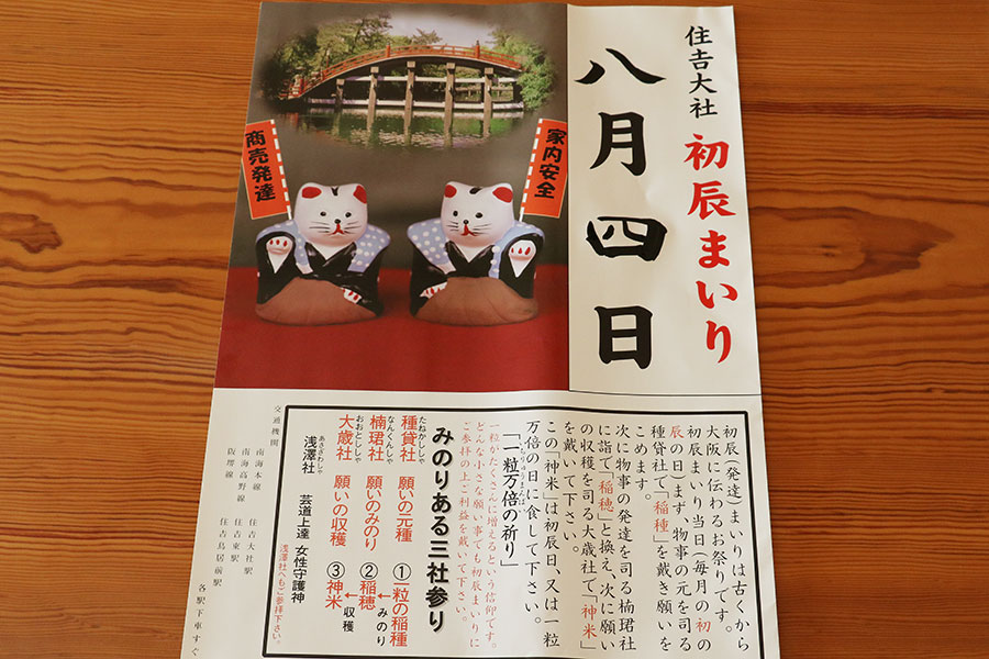 きっかけは、月に1回おこなう住吉大社の名物『初辰まいり』のポスターでした。毎月日にちが異なるのでポスターも作り替えるのですが、招福猫や反橋(そりはし)の写真を使ったデザインに事務員さんが日付を墨書して20年ほど作っていたんです。