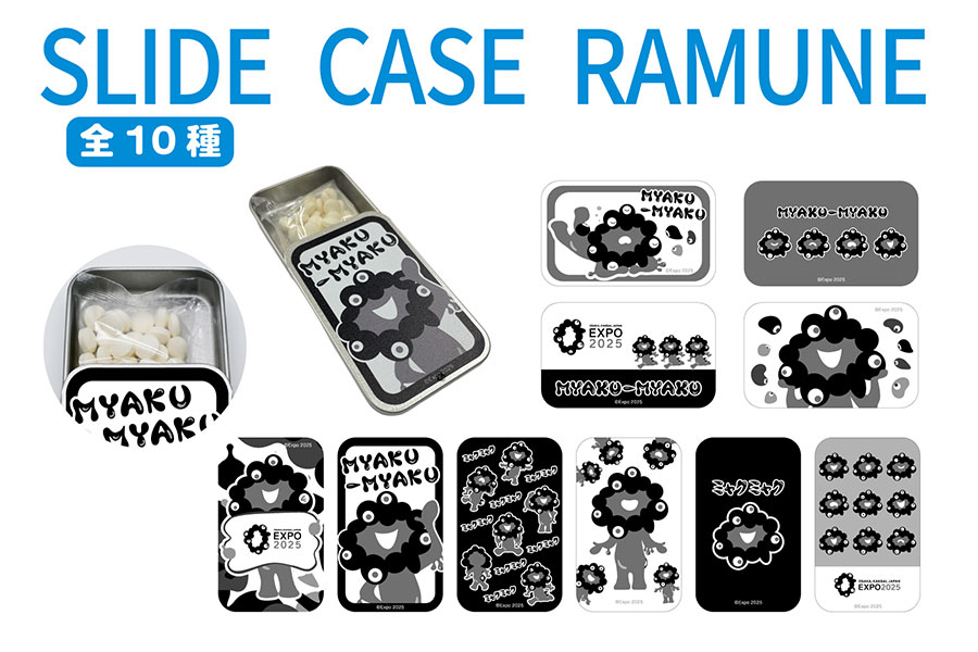 加えて2月上旬からは新たな黒ミャクグッズとして新たに『シークレットスライド缶入りラムネ』(10種・864円)、『チョコクランチ缶』(3種・1728円)、『マルチケース入りチョコ』(3種・1188円)の3種が仲間入り。缶入りラムネはランダム仕様となっており、パッケージにはさまざまな姿の黒ミャクがプリントされている。