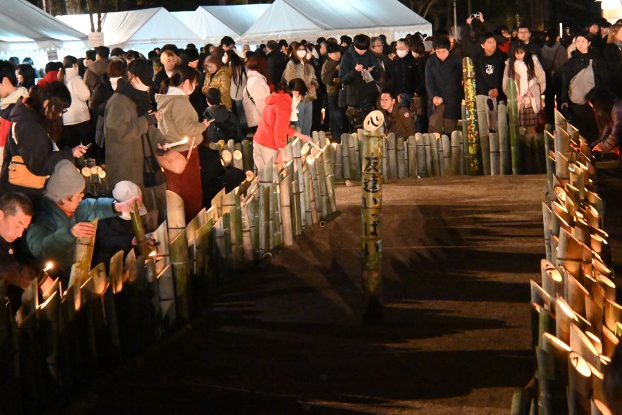 • 東遊園地では、竹灯籠や紙灯籠で文字を描く。31年目の震災の日をここからスタートさせる人は多い(2026年1月17日/東遊園地 Lmaga.jp編集部撮影)