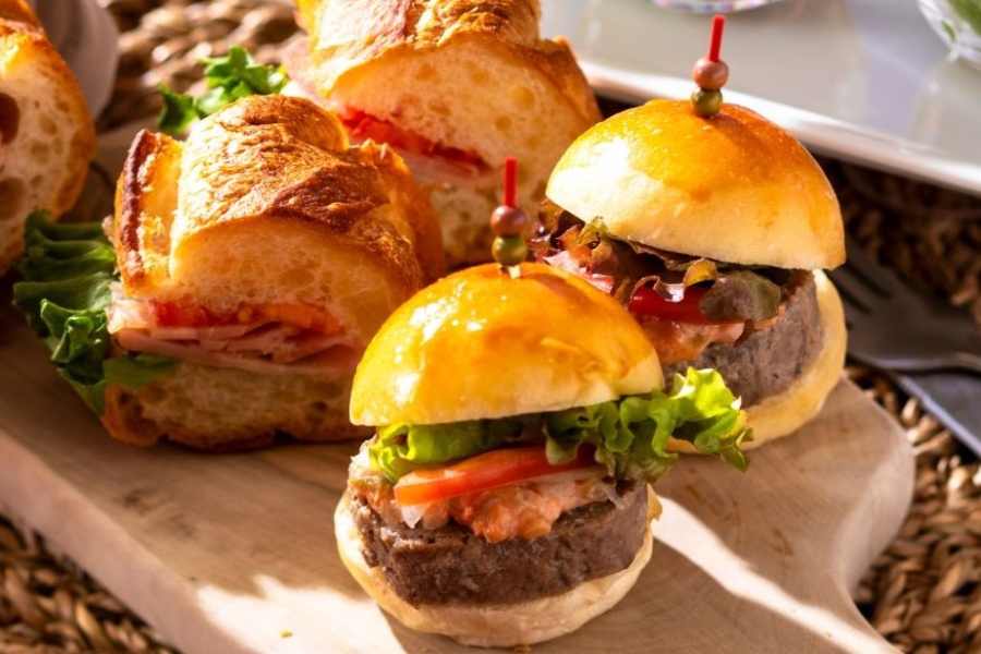 「ホテルの宴会、パーティーなどでも人気のバターロールのミニサイズで作ったハンバーガー。バター、全卵、卵黄を配合したリッチな生地は、サンドする具材に全然負けてない!『頬張って食べるタイプのパンだから、歯切れの良さを意識した焼き上がりにした』というシェフの気配りもうれしい。サンドされたパティももちろんおいしかったです」