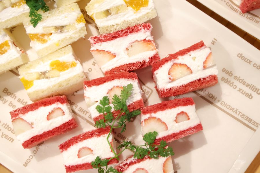 「こちらもホテルの宴会にも登場する食パンを使用したカクテルサンド(3色サンド)のバリエーション。ビーツパウダーを配合し、ピンク色の食パン生地も鮮やかな『いちごサンド』は、フレッシュいちごのほか、生クリームとヨーグルトクリームのさっぱりした味わいが楽しめます。ほんのり感じる酸味が甘すぎず、とても食べやすかったです」