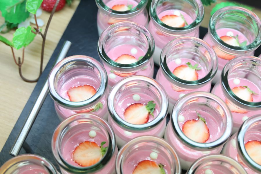 「芳養シェフのピクニック感を出すための工夫が印象的でした。パイ一つにしても、先ほど紹介したこだわりがあり、牛乳瓶に入ったムースや、パウチに入ったいちごジュレ、スティックに刺さったいちごファッジなど…屋外で気軽に楽しめるデザートのよう。