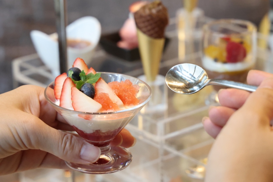 アフタヌーンティーと並んで、「ザ・ラウンジ」で、大人気のメニュー「ストロベリーパフェ」が、ミニサイズのアフタヌーンティー特別仕様で登場。美しくカットされた旬の国産いちごとともに、シャリシャリ食感のいちごのグラニテ、チョコクランチなど、さまざまな味と食感をさわやかに楽しめる。