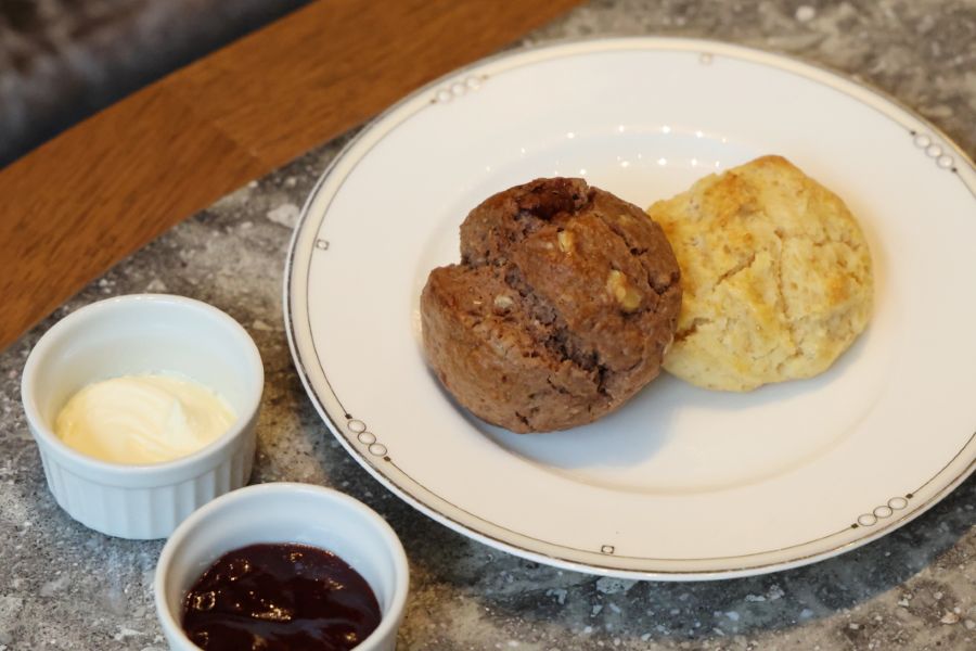 また、「単品で買いたい!」という声も多数あがる同ホテルで焼き上げる人気のスコーンは、今回2種がスタンバイ。「プレーンスコーン」と、こちらも「リンツチョコレート」を使用した「ミルクチョコレートとヘーゼルナッツのスコーン」だ。