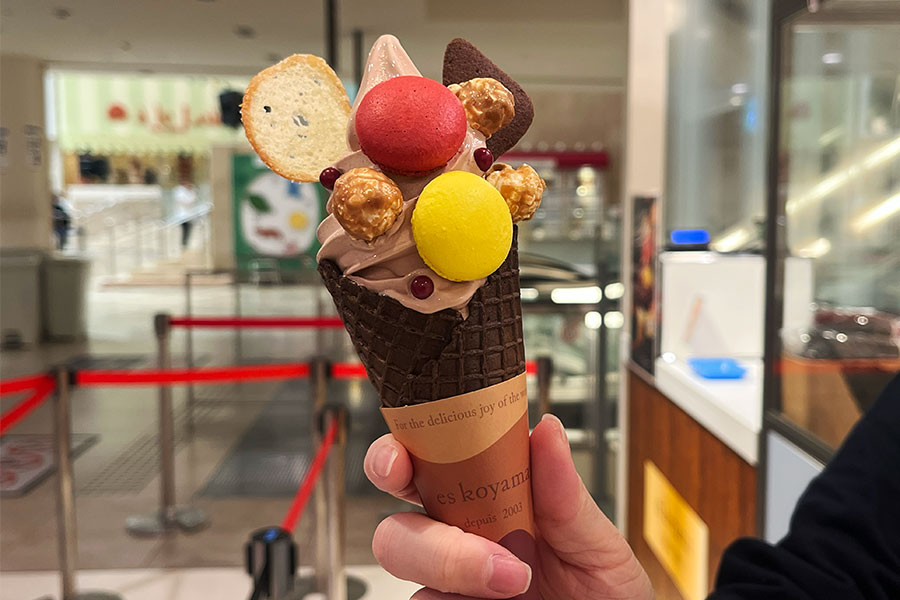 同催事でチョコレートやバウムクーヘンを販売する兵庫・三田の洋菓子店「エスコヤマ」でもソフトクリームを取り扱う。インドとペルー産のカカオをブレンドしたビターな味わいのソフトクリームに、マカロンやラスク、キャラメルポップコーンなどをトッピング。「ダブルショコラカーニバル」という名の通り、ポップなビジュアルが魅力的だ。