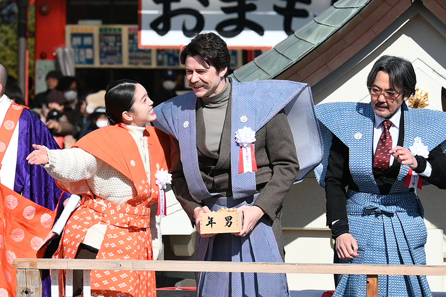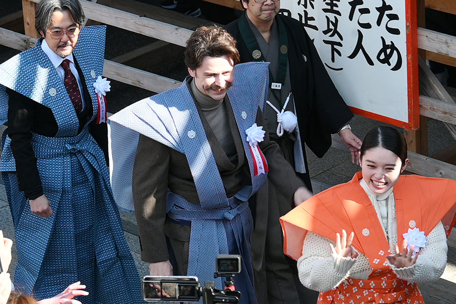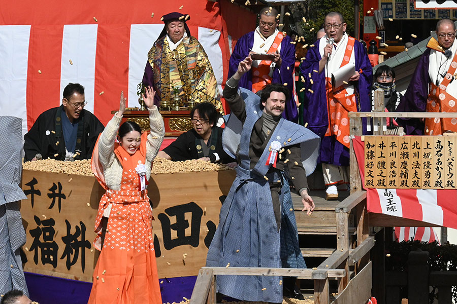 「成田山不動尊」(大阪府寝屋川市)で2月3日、恒例の『節分祭』が開催。連続テレビ小説『ばけばけ』(NHK)でヒロイン・トキを演じる髙石あかり、その夫でレフカダ・ヘブンを演じるトミー・バストウ、トキの父・司之介を演じる岡部たかしが登場した。