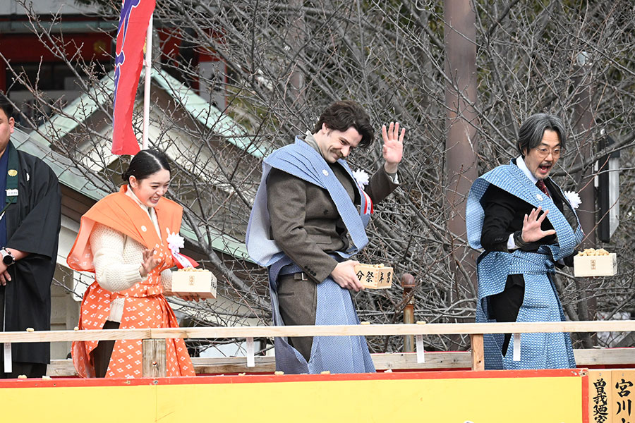 境内には鬼がいないとされるため「福は内」のみの掛け声のなか、3人は豪快に豆まき。「おトキちゃん〜!」「ヘブンさん!」「父上〜!」と役名で呼ばれ、3人は笑顔で応えながら約2万人(朝11時時点)の参拝客に福を分けた。