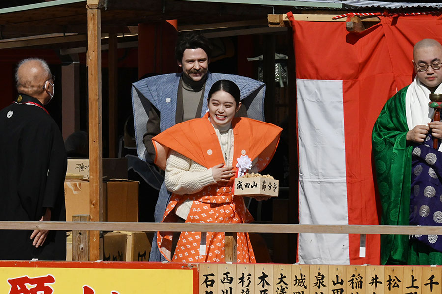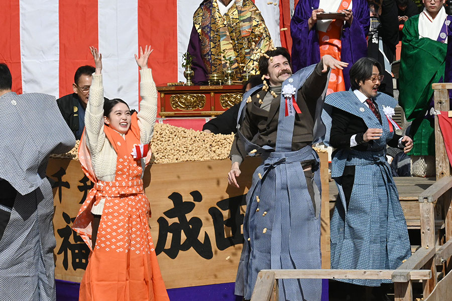 連続テレビ小説『ばけばけ』(NHK)に出演する髙石あかり、トミー・バストウ、岡部たかしが2月3日、「成田山不動尊」(大阪府寝屋川市)恒例の『節分祭』に登場。集まった約2万人に全力の笑顔で福を分けた。