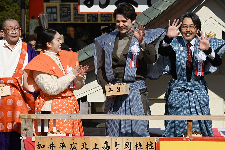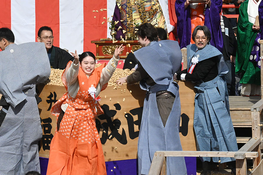 毎年恒例となっている連続テレビ小説の出演者らによる屋外特設舞台での豆まき。境内には鬼がいないとされるため「福は内」のみの掛け声のなか、3人は「おトキちゃん〜!」「ヘブンさん!」「父上〜!」と役名で呼ばれ、笑顔で応えていた。