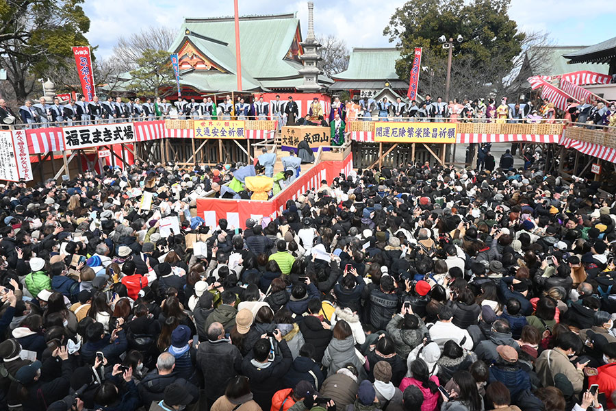 今年、成田山不動尊での節分祭では<世界の願い>交通安全を主願とし、開運厄除、繁栄隆昌を祈願。お年寄りや子どもには福豆が無料で授与され、売り上げの一部を交通遺児救済の募金とする福豆の頒布もおこなわれる。