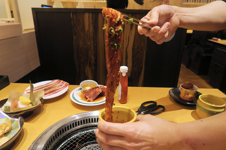 焼肉きんぐ名物メニュー「長い!!23㎝ 壺漬けドラゴンハラミ」(Lmaga.jp撮影) ■「都市型店舗」は何が違う?