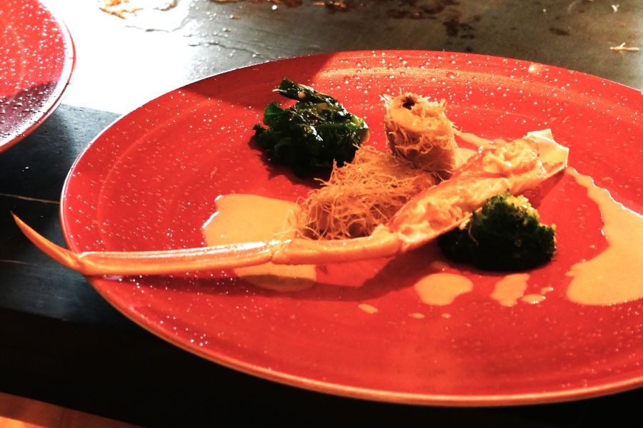 • 「鳥取県産松葉蟹ソテー とうふちくわのカダイフ巻き オリエンタルソース」ヒルトン大阪の鉄板焼コースより