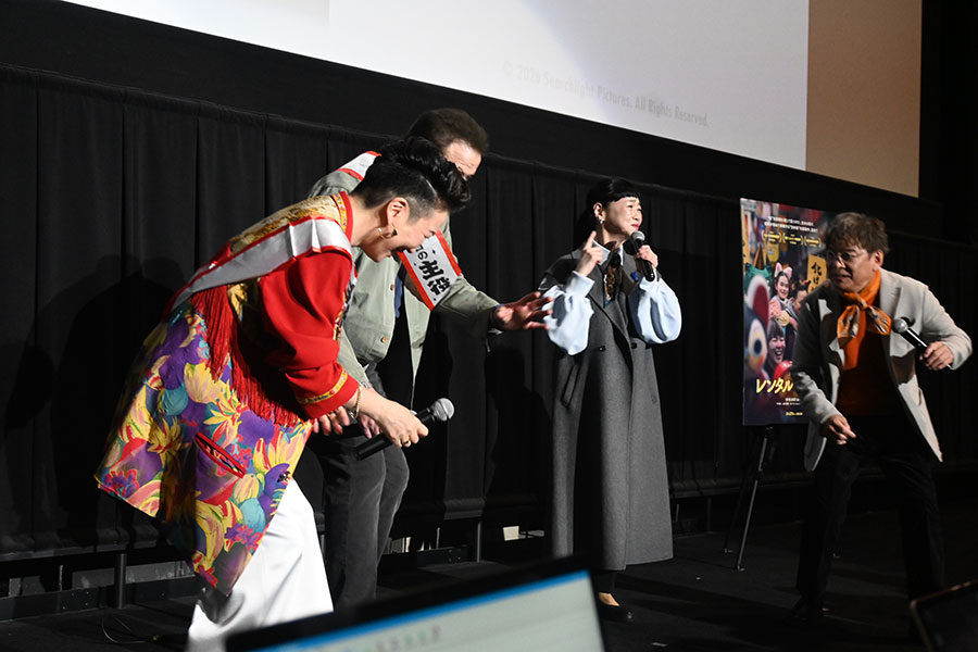 • 映画『レンタル・ファミリー』の舞台挨拶に登場した(左から)HIKARI監督、ブレンダン・フレイザー、未知やすえ、内場勝則(2月5日・大阪市内)