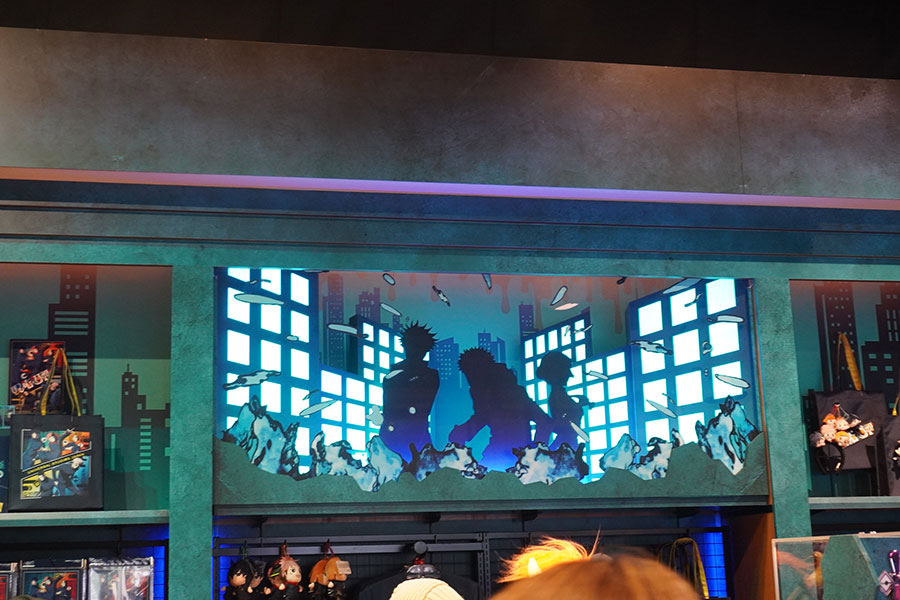 また、店内の上部には今回のコラボで新作が公開されたばかりのシアター・ショー・アトラクション『呪術廻戦・ザ・リアル4-D』に連動した装飾。呪術高専東京校1年の3人のほか、彼らが召喚する式神のシルエットなども店内各所に施されている。