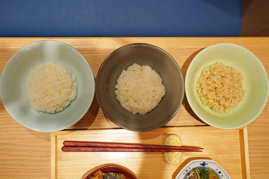 最大の魅力は、ご飯がおかわり自由であることだ。常時3種類が食べ放題で、粘りの強さによって炊き分けた白米が2種類と、玄米やもち麦などの「健康応援米」1種類が並ぶ。