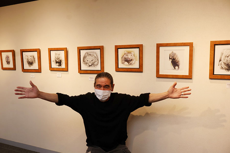 • ワインの誕生日に合わせて、作品展を開いたイラストレーターの山本勉さん(2月11日撮影、池田市)