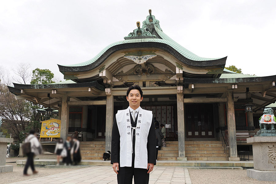 全国の豊國神社のなかでも、唯一秀長を祀っている同神社。命日の2月15日におこなわれる慰霊祭は、例年は神社の関係者のみで行っているが、今年は『豊臣兄弟!』が放送されている縁で、キャスト・スタッフを代表して仲野と松川CPが参加。
