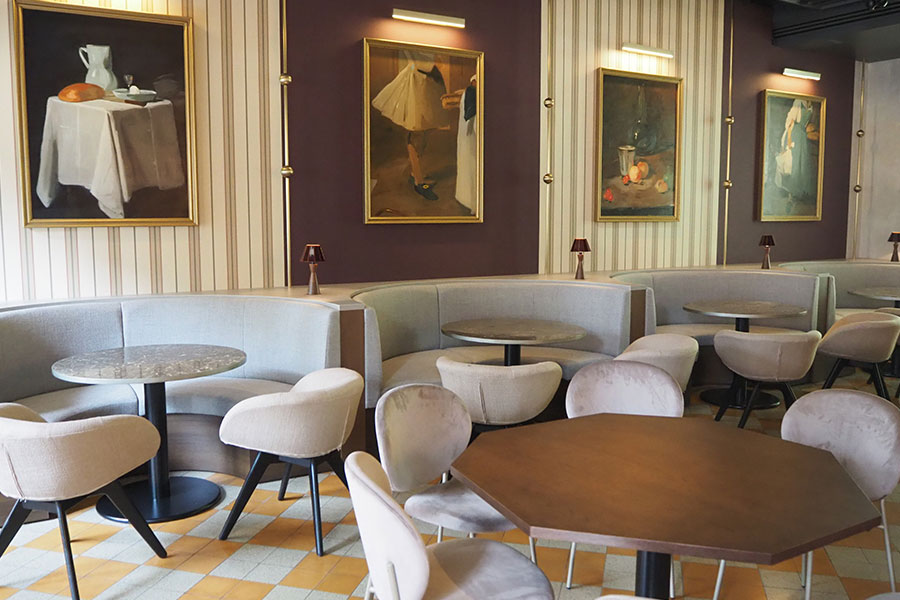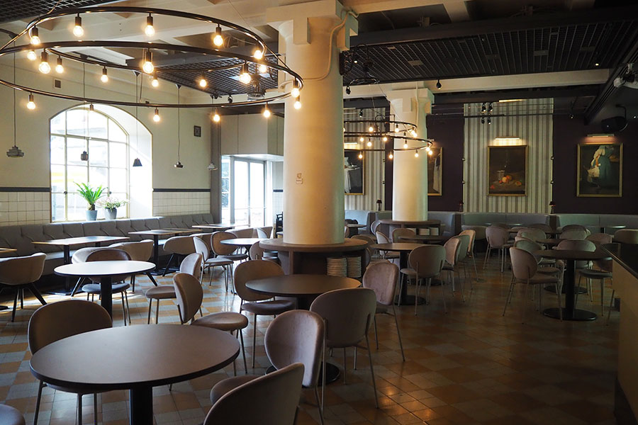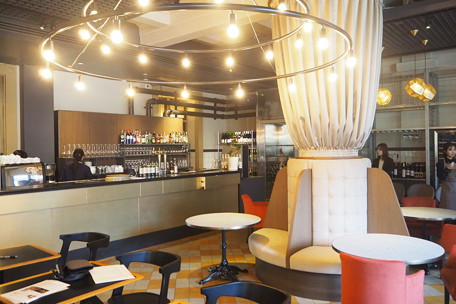 1918年に開業した公会堂のネオルネッサンス様式を引き継ぐ「食の社交場」として誕生する同店。店内は大きなシャンデリアや既存の円柱を活かしたベンチなど、モダンとクラシックが融合した空間に約120席が広がる。