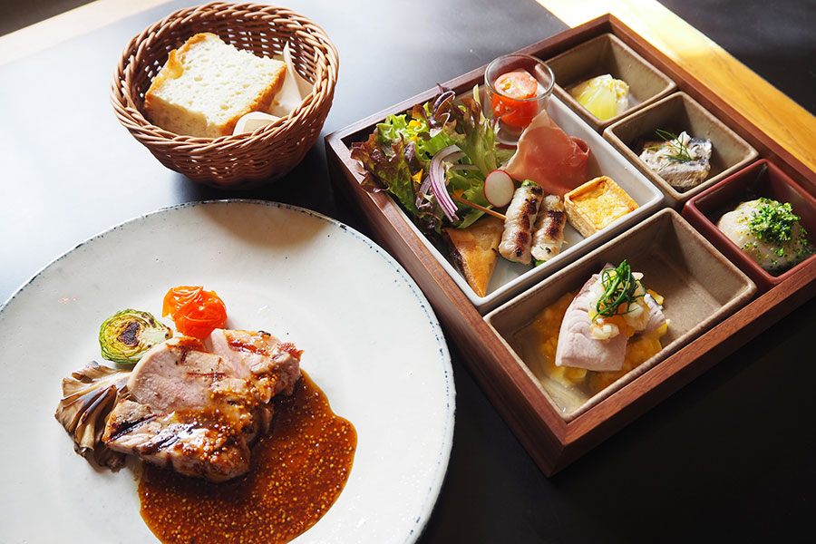 ランチの「箱前菜コース」(4700円)は、野菜・肉・魚類の前菜が10品も詰まったセットが魅力で、「淡路たまねぎのキッシュ」「丹波黒どりの春巻き」など、関西の食材を使ったものも。メインは「豚肩肉のグリル」など3種から好みの品をチョイスできる(前日17時までに要予約)。
