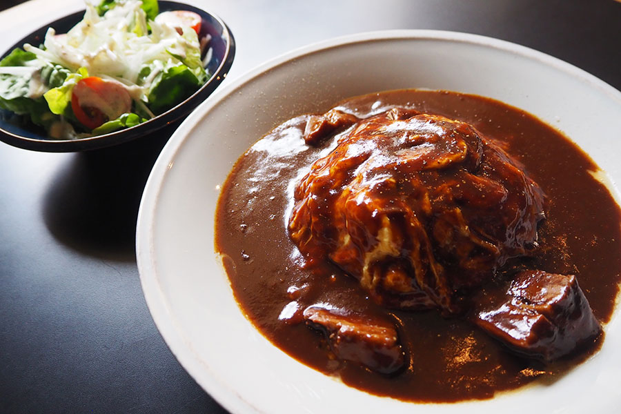 そして公会堂と言えば、歴代の地下レストランで時代ごとに変化しつつ引き継がれている、定番メニューのオムライス。前店舗で人気だった「国産牛肉煮込みのオムライス」(ランチセット1600円、ディナー単品980円)を、同店でもいただける。