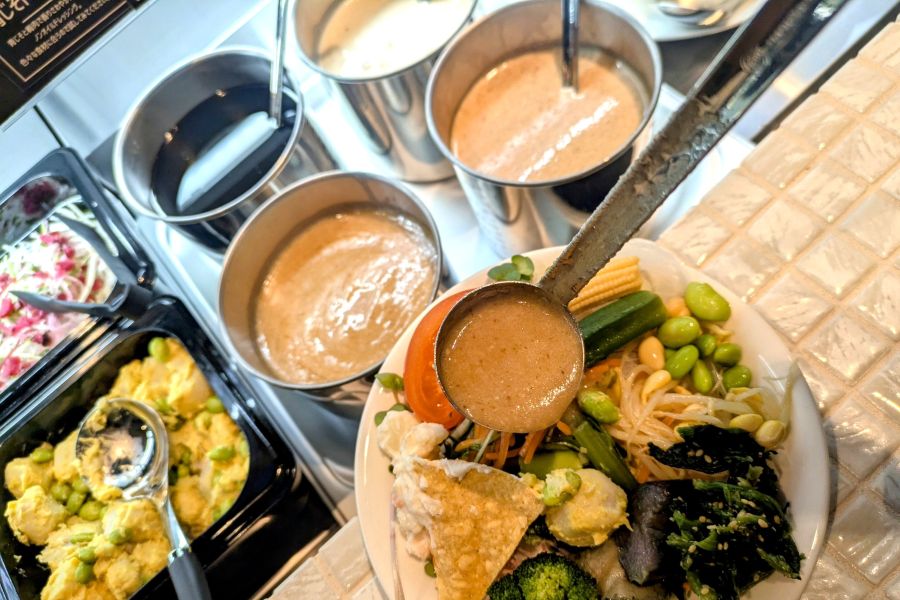 そしてテレビ番組『マツコの知らない世界』(TBS)でも取り上げられた絶品コーンスープ、デザートまで45品目と大充実。特に、北海道産のコーンを収穫後7時間以内にスチームして甘みと旨みを引き出したコーンスープはファンも多く、サラダバーの目玉になっている。