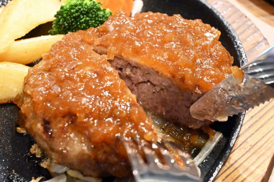 ステーキのあさくまで人気のあさくまハンバーグやサーロインステーキ。サラダバーなどサイドメニューにも特徴が(2月17日撮影「ステーキのあさくま 西梅田ハービスプラザ店」)