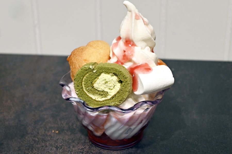 ソフトクリームをメインに、ゼリーやヨーグルト、フルーツ、ホイップクリームなど、好きなデザートを自由に乗せてオリジナルミニパフェに。ケーキやプチシュークリームなどものせて豪華に飾りつけも。