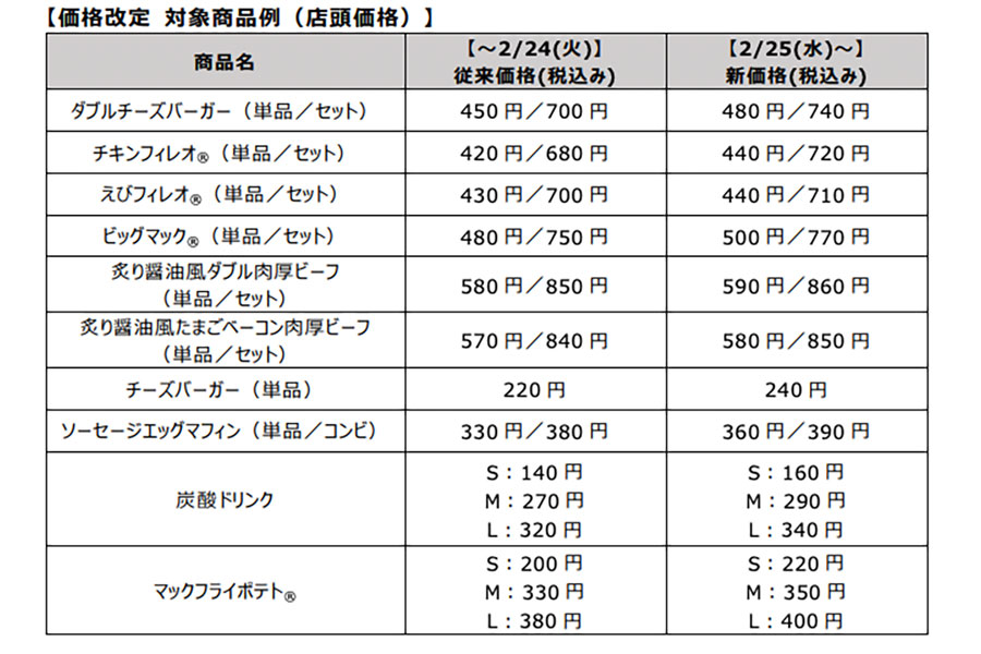 同日からの価格改定(約6割の商品を10円~50円改定)に伴い、「プレミアムローストコーヒー」(ホット)はSサイズが120円〜から140円〜に値上げ。Mサイズは180円〜で据え置きとなる。