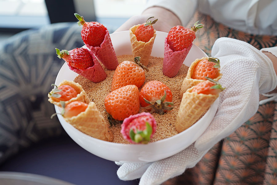 2月1日からは、いちごが主役のアフタヌーンティー「エレガンス・イン・ストロベリーブルーム」が始まっている。まず、花束のような「苺のプティ・コルネ」が席まで届けられ、いちごの世界へと誘われる。