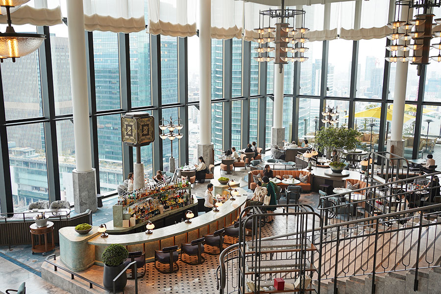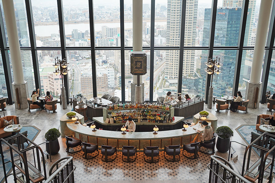会場となるのは、ホテル28〜29階のラウンジ&バー「ピーコック・アレー」。フロア2階分、天井高8mの開放感あふれる空間の中央には「大階段」が鎮座する。また、目の前には「梅田スカイビル」を臨み、梅田越しに広がる、大阪の景色が一望できる。