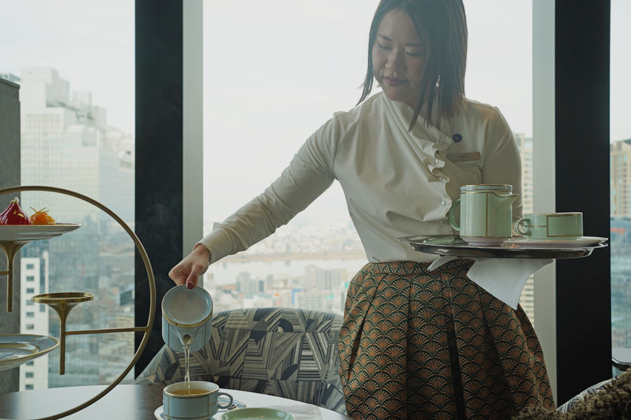 また、高級ホテルならではのこだわりを感じられるのは、アフタヌーンティーだけじゃない。飲み放題のコーヒー&紅茶を提供する、バリスタのチカさんは、大阪のカフェで働いていたところを、ホスピタリティの高さでスカウトされた。