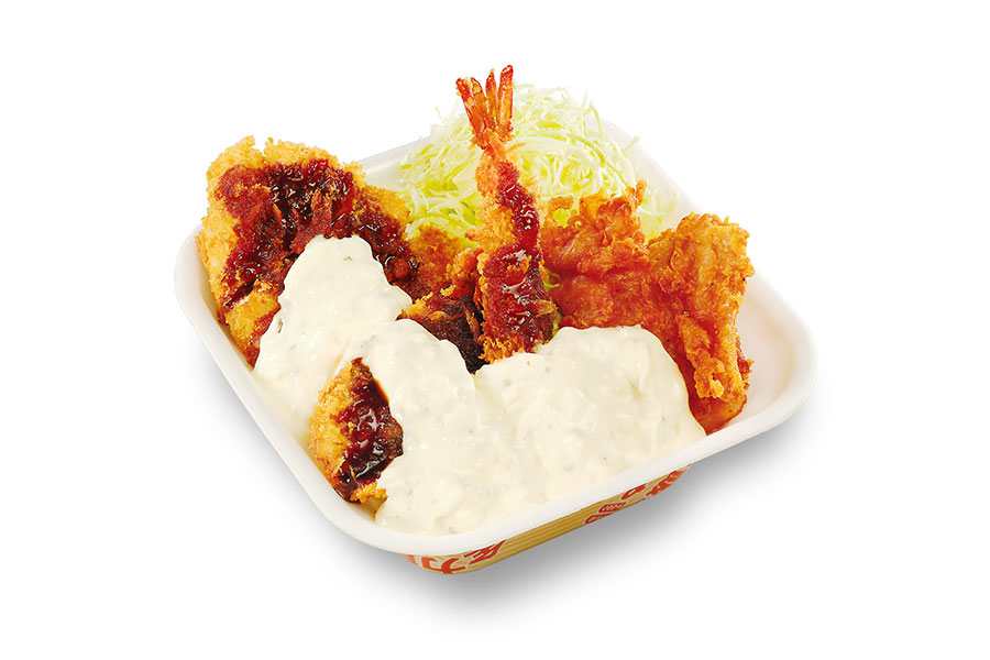 今回の新作は、サクサクに揚げた「海老フライ」「チキンカツ」「から揚げ」に加え、定番のあじフライ…ではなく「鯖(さば)フライ」という変化球もプラス。4種を豪快に丼へ詰め込み、特製ソース&どっさりタルタルソースで仕上げたボリューム満点な一杯だ。