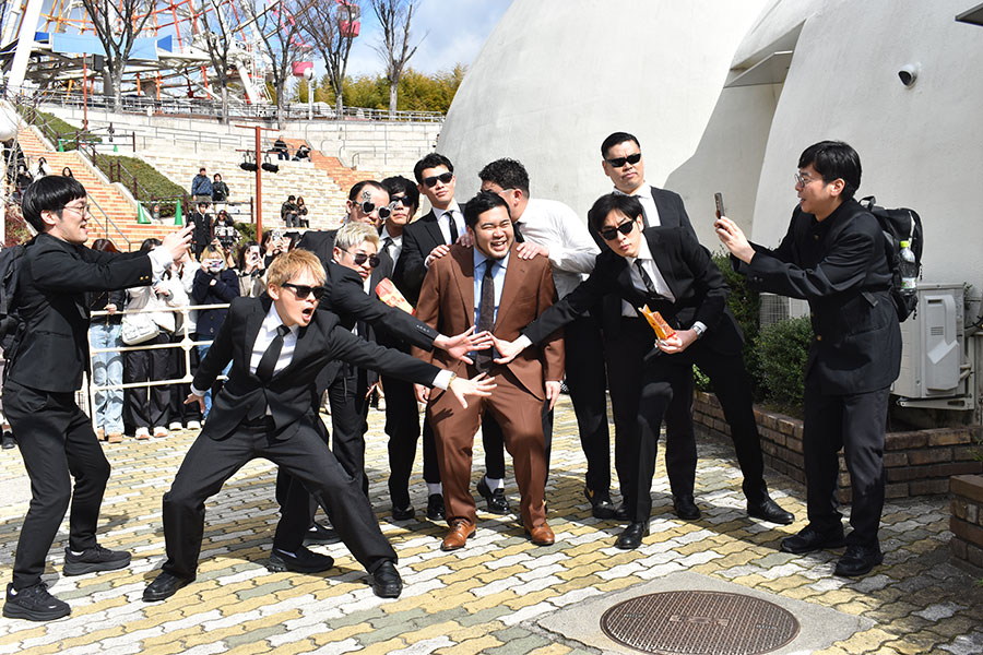 そしてスタート地点に芸人たちが現れるとわっと歓声が。黒スーツ姿の「SP」に扮した芸人たちがケムリを護るように取り囲み、そしてその現場に遭遇した学生役の男性ブランコの2人が物珍しげに写真を撮る寸劇が繰り広げられた。