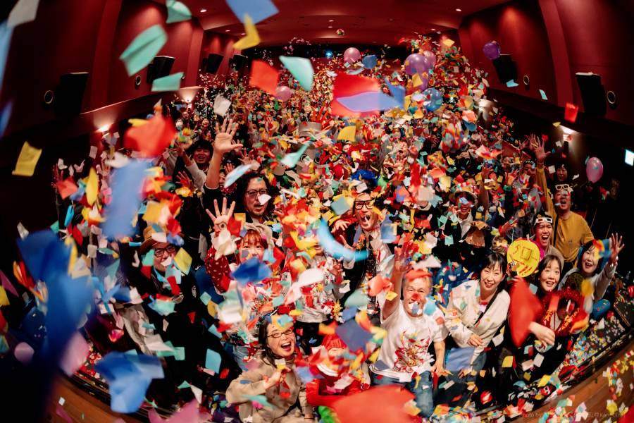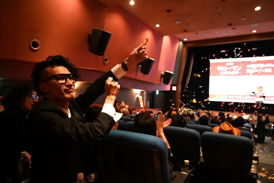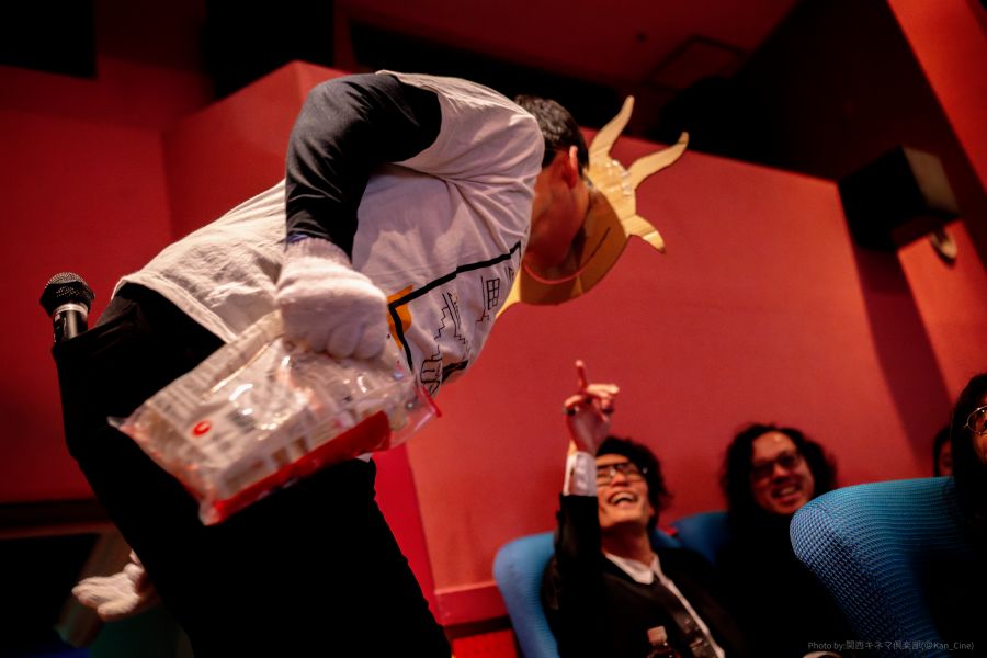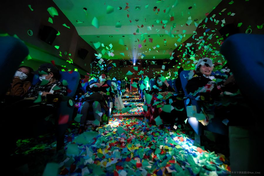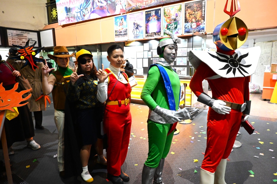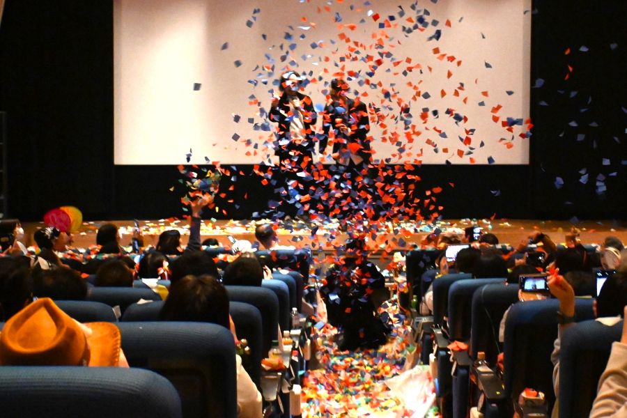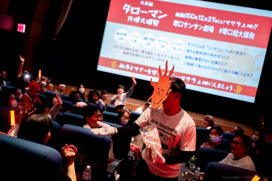そして「応援上映」と言えば、そう、超個性派映画館「塚口サンサン劇場」(尼崎市)である。同館でも、紙吹雪やクラッカーなどで盛り上げる「応援してはいけないマサラ上映」スタイルで「昭和100年」の最後に満を持してイベント『塚口大爆発』を実施。本作で監督・脚本ほか八面六臂の大活躍の藤井亮、タローマンなど約12役を演じた主演の岡村渉の両名がサプライズ登場した。今回は『塚口大爆発』体験後の、インタビューとともに当日の様子を紹介する。