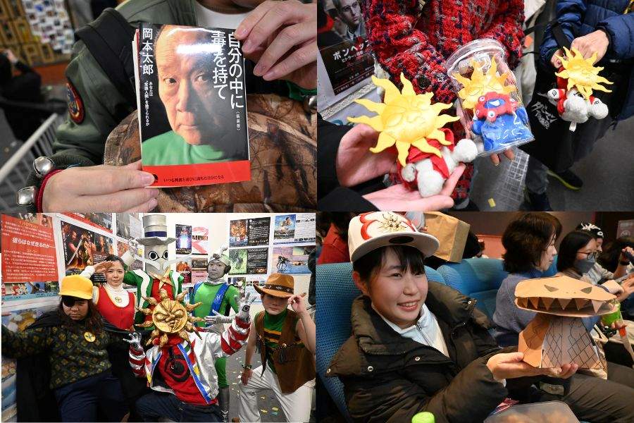 「マサラ上映」当日、タローマンに登場する水差し男爵やエラン、地球防衛軍(CBG)メンバーなどのコスプレーヤーたちが続々劇場に集まってくる。映画の公式グッズをカスタムする人、岡本太郎の概念アイテムを自作する人、岡本太郎氏の著作『自分の中に毒を持て』を持つ人…などなど個性爆発な老若男女が塚口サンサン劇場「シアター4」に続々と入ってきて、かなりカオスな状態に。