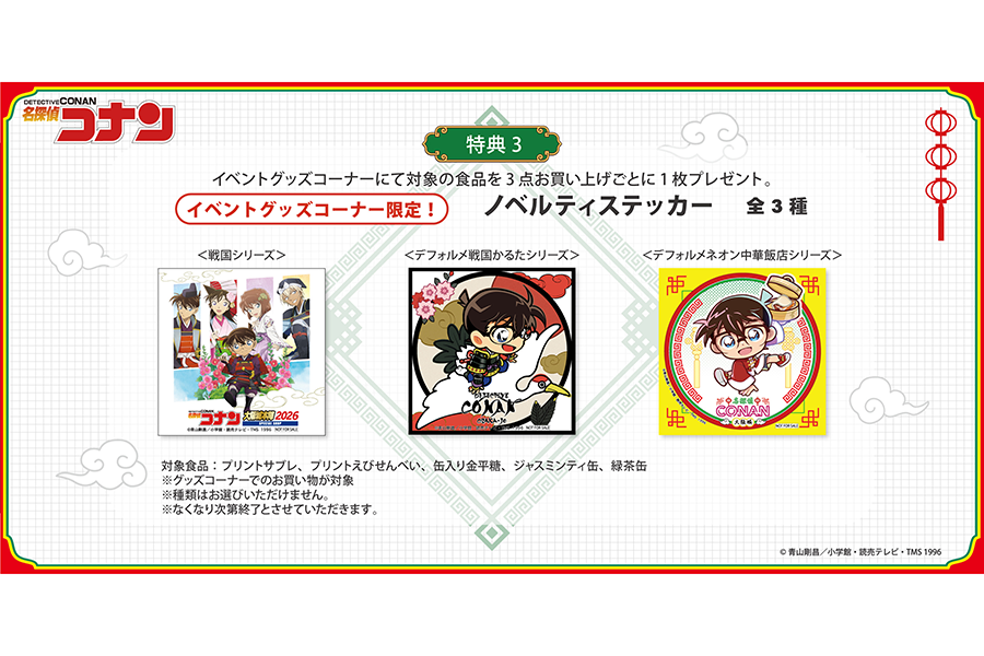• 『名探偵コナン大阪城本陣SPECIAL SHOP』(場所:ミライザ大阪城)で対象商品3点を購入するともらえる「ノベルティステッカー」