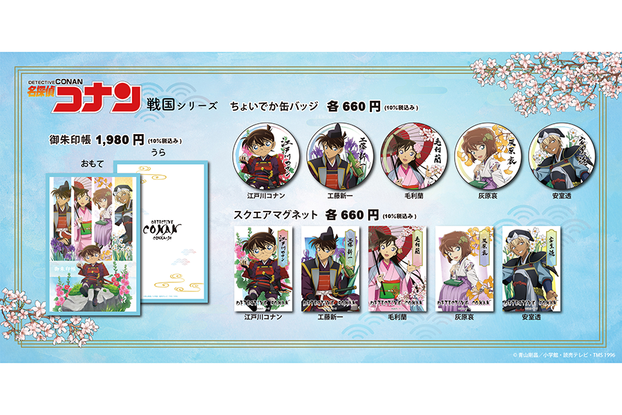 • 『名探偵コナン大阪城本陣SPECIAL SHOP』(場所:ミライザ大阪城)で発売される「御朱印帳」(1980円) 「ちょいでか缶バッジ」(各660円)「スクエアマグネット」(各660円)