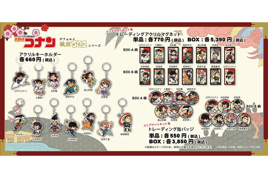 • 『名探偵コナン大阪城本陣SPECIAL SHOP』(場所:ミライザ大阪城)で発売される「アクリルキーホルダー」(各660円)、「トレーディングアクリルマグネット」(単品 各770円/BOX 5390円)、「トレーディング缶バッジ」(単品 各550円/BOX 3850円)